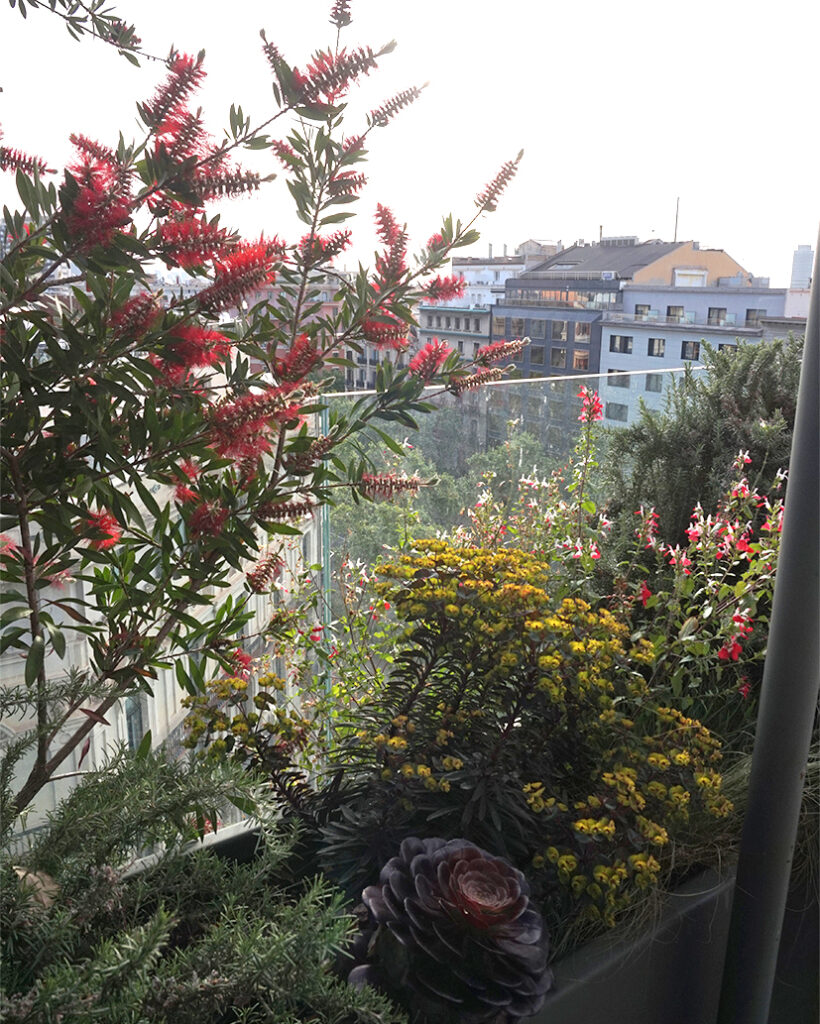 En aquestes terrasses, vam apostar per plantes autòctones mediterrànies, adaptades al clima i de baix manteniment, plantades en jardineres metàl·liques que aporten un aspecte modern i cosmopolita en harmonia amb l’arquitectura de l’edifici. L’objectiu era crear un espai exterior que inspirés tranquil·litat i benestar, fomentant un ambient de treball més agradable i connectat amb la natura.